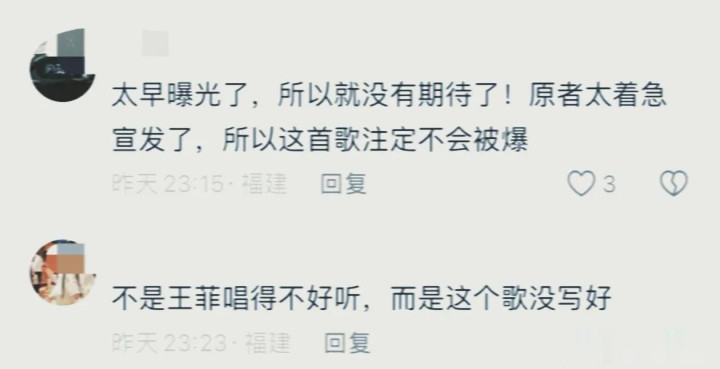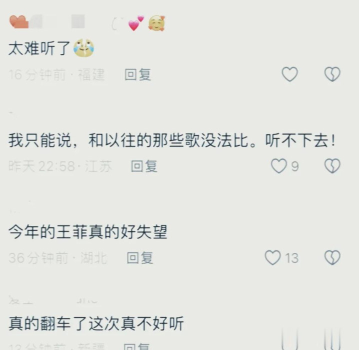 选歌错误,王菲的年纪也上来了,声音不再空灵如初,气息也微弱了许多,好比一台年久失修的车子被扎破了轮胎,跑得有气无力,倒是显得隔壁的任素汐音色极度甜蜜饱满,满格在线。